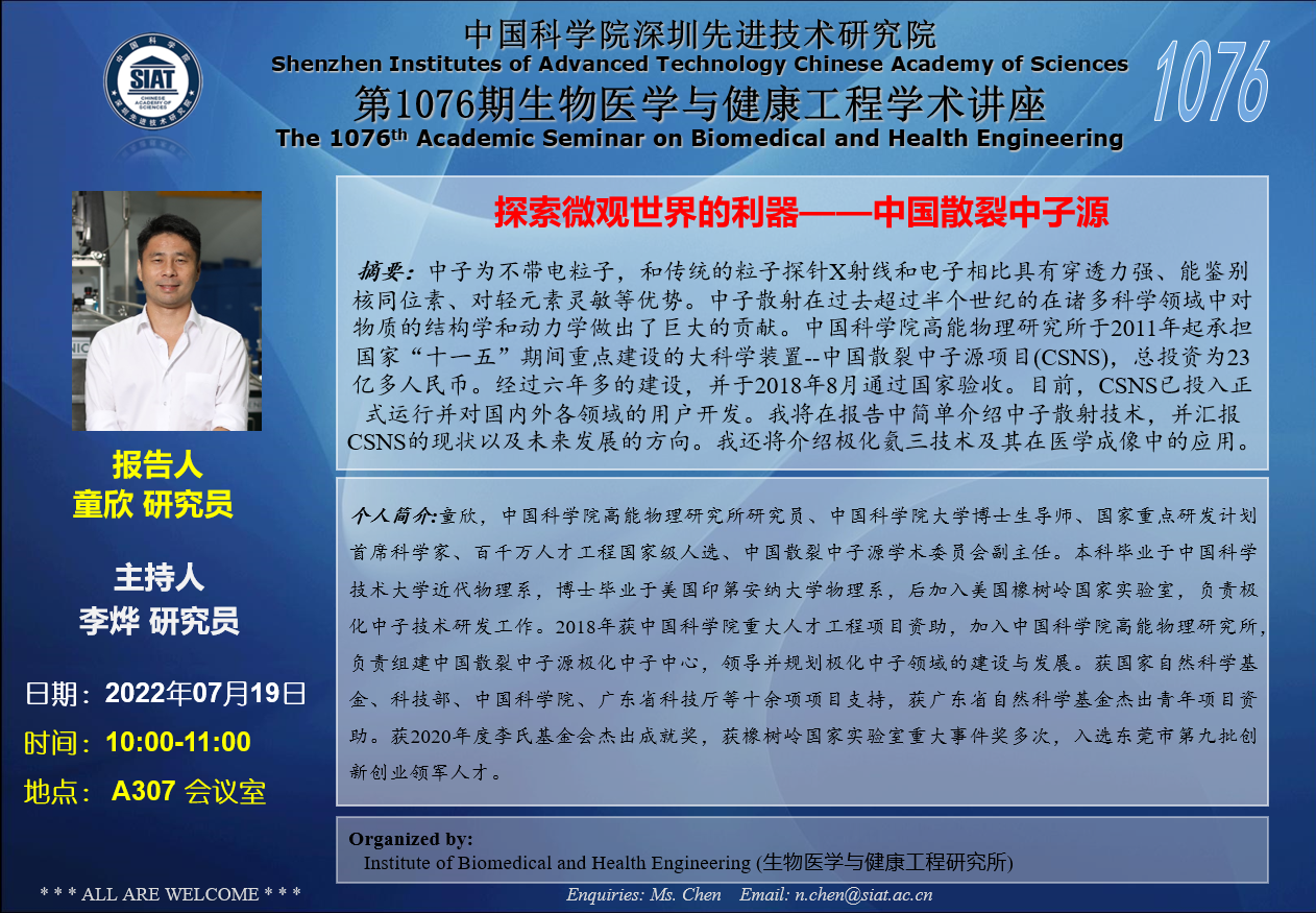大家好!医工所将举办第1076期生物医学与健康工程学术讲座,特邀童欣,中国科学院高能物理研究所研究员,博士作题为“探索微观世界的利器——中国散裂中子源”的学术报告。诚挚邀请大家参加学习和交流!