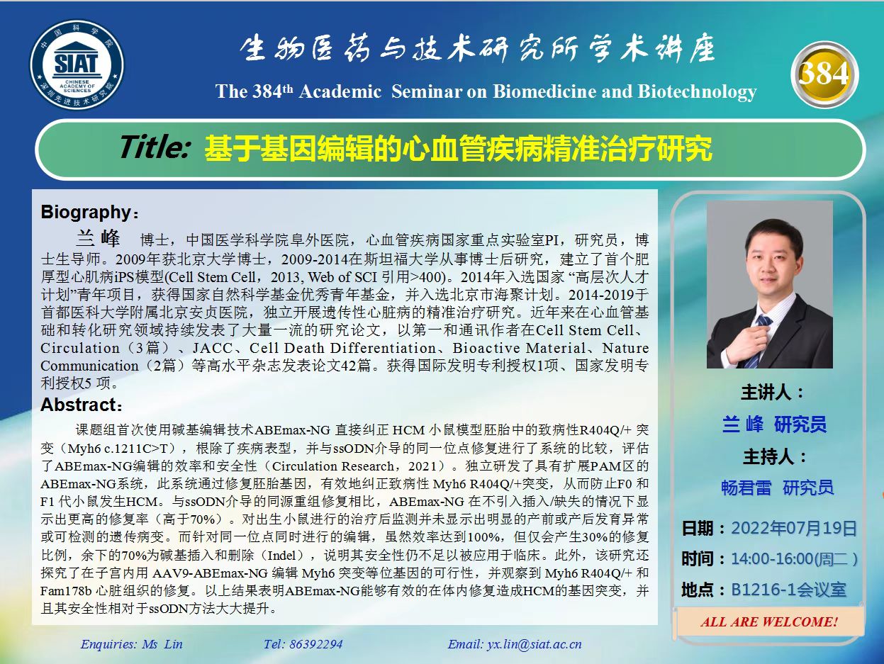 医药所第384期学术讲座将于2022年7月19日 星期二 14:00-16:00 在先进院 B1216-1会议室 举行。本次讲座邀请了来自中国医学科学院阜外医院,心血管疾病国家重点实验室,兰 峰 研究员带来“基于基因编辑的心血管疾病精准治疗研究”的报告。届时,畅君雷 研究员 将主持讲座。