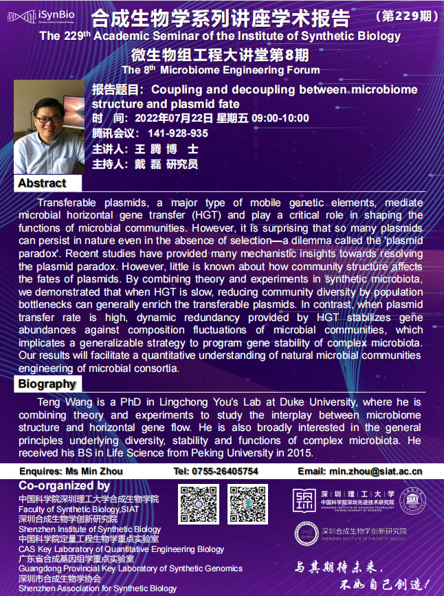 本次讲座邀请了 杜克大学 王腾 博士 带来题为“Coupling and decoupling between microbiome structure and plasmid fate”的报告。