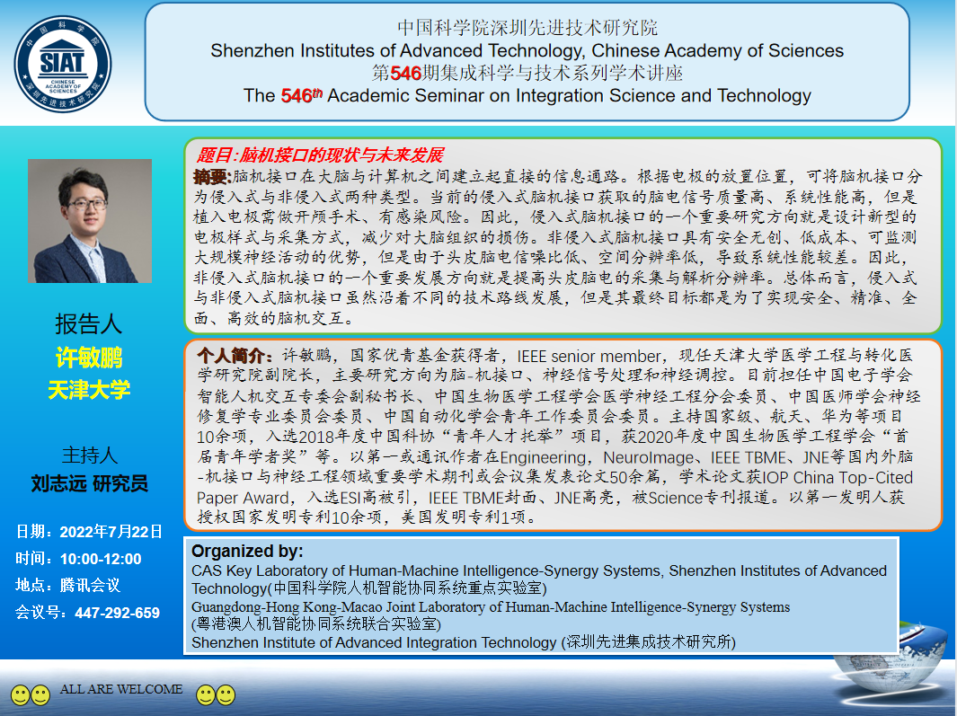 集成所第546期集成科学与技术系列学术讲座将于7月22日(周五)上午10:00-12:00在腾讯会议召开,会议号:447-292-659。本次讲座特邀天津大学的许敏鹏 副教授作题为《脑机接口的现状与未来发展》的学术报告。