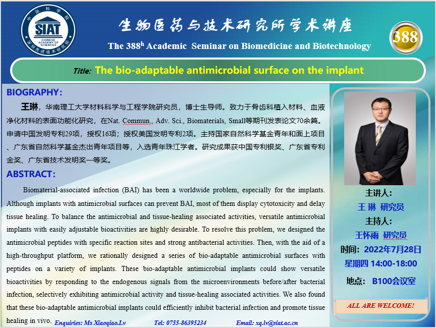 医药所第388期学术讲座将于2022年7月28日 星期四 14:00-18:00 B100会议室 举行。本次讲座邀请了来自华南理工大学材料科学与工程学院,王琳 研究员带来“The bio-adaptable antimicrobial surface on the implant”的报告。届时,王怀雨 研究员 将主持讲座。
