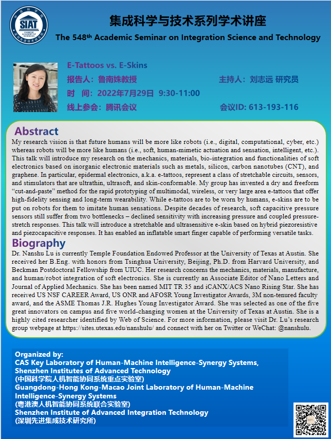 集成所第548期集成科学与技术系列学术讲座将于7月29日(周五)上午9:30-11:00在腾讯会议召开,会议号:613-193-116。本次讲座特邀美国德克萨斯大学奥斯汀分校的鲁南姝 教授作题为《E-Tattoos vs. E-Skins》的学术报告。