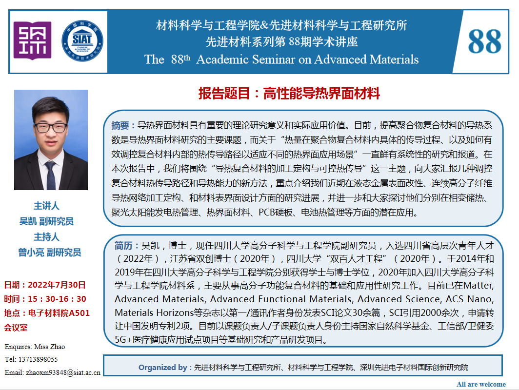 材料科学与工程学院 & 先进材料科学与工程研究所“先进材料系列”第88期学术讲座将于7月30日(周六)15:30-16:30,在宝安电子材料院A501会议室进行。