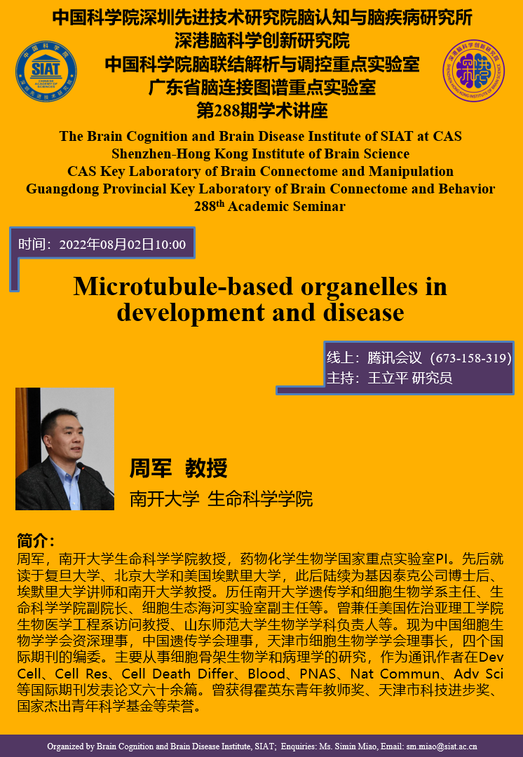 本次讲座由南开大学,周军教授,带来作题为“Microtubule-based organelles in development and disease”的专题报告。