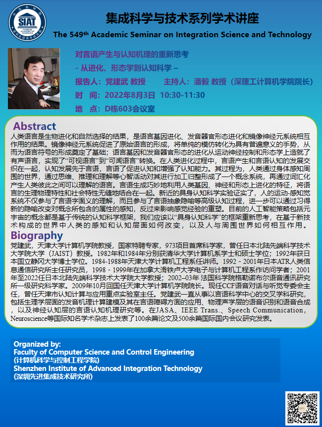 集成所第549期集成科学与技术系列学术讲座将于8月3日(周三)上午10:30-11:30在D栋603会议室召开。本次讲座特邀天津大学的党建武 教授作题为《对言语产生与认知机理的重新思考 - 从进化、形态学到认知科学 -》的学术报告。