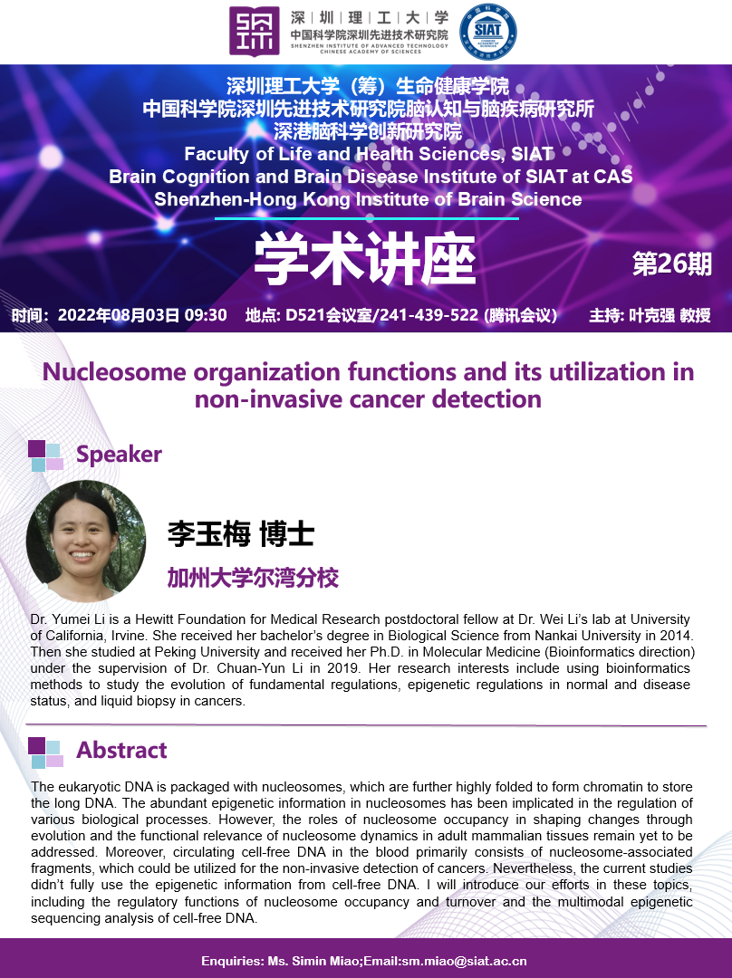 美国加州大学尔湾分校,李玉梅博士将带来“Nucleosome organization functions and its utilization in non-invasive cancer detection”的专题讲座。