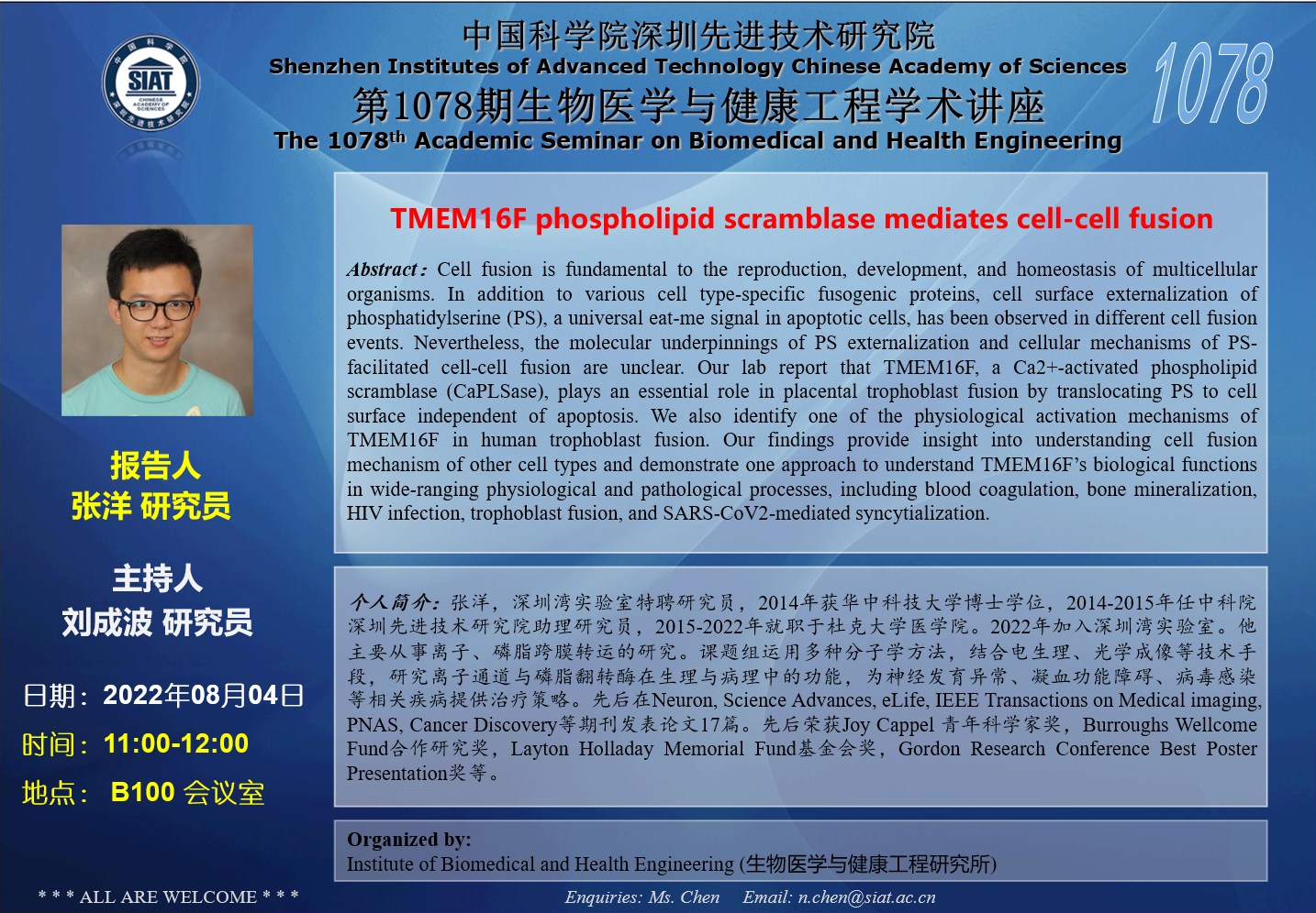 医工所第1078期学术讲座将于 8月4日(周四)11:00-12:00 在 B100会议室 举行。