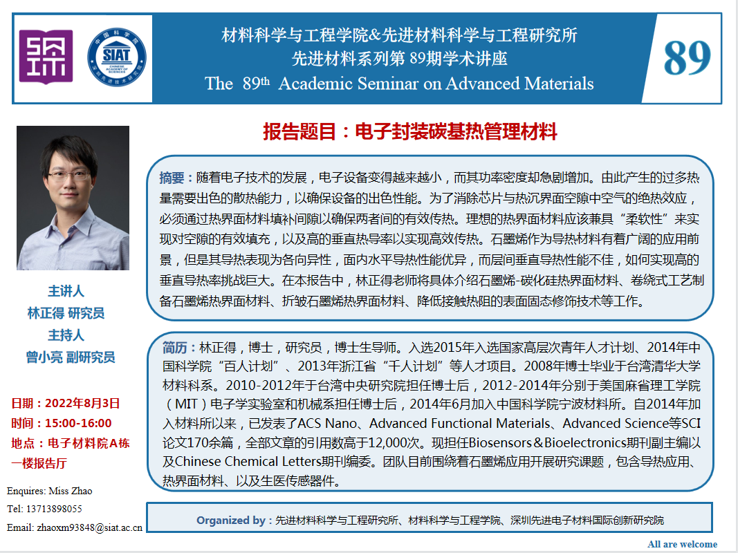 【2022年8月3日 材料科学与工程学院 & 先进材料科学与工程研究所】电子封装碳基热管理材料