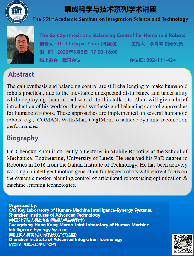 集成所第551期集成科学与技术系列学术讲座将于8月3日(周三)下午17:00-18:00在腾讯会议召开,会议号:992-111-424。本次讲座特邀利兹大学的周晟煦 助理教授作题为《The Gait Synthesis and Balancing Control for Humanoid Robots》的学术报告。