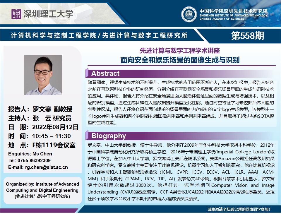 大家好!先进计算与数字工程研究所/计算机学院学术讲座第558期将于8月12日(星期五)10:45-11:30在F栋1119会议室举行,本次讲座将邀请中山大学 罗文寒 副教授作题为“面向安全和娱乐场景的图像生成与识别”的报告。本次报告将由数字所 张云 研究员主持,诚挚邀请大家参加、学习和交流!