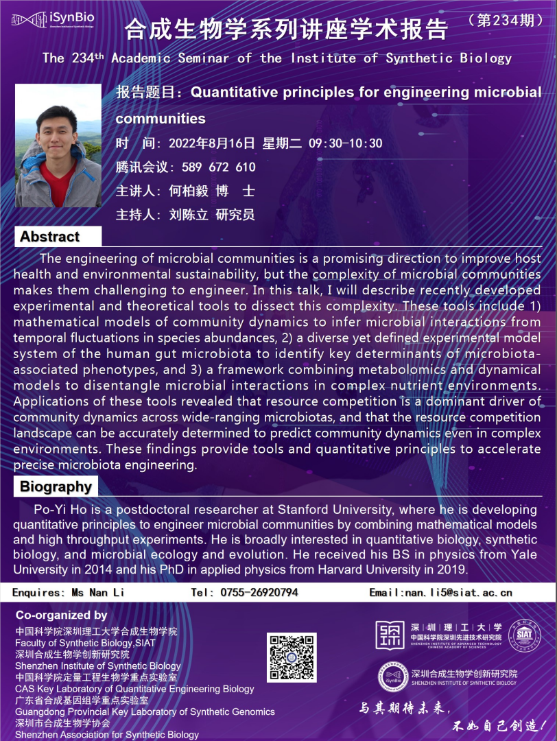 本次讲座邀请了 斯坦福大学 何柏毅 博士 带来题为“Quantitative principles for engineering microbial communities”的报告。