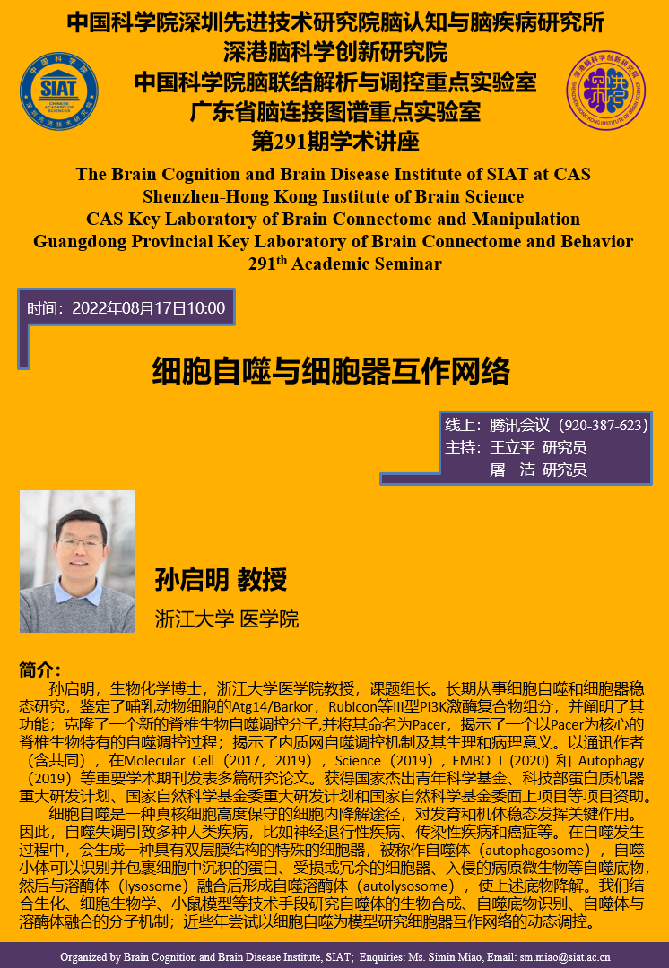 【2022年08月17日 脑认知与脑疾病研究所】细胞自噬与细胞器互作网络