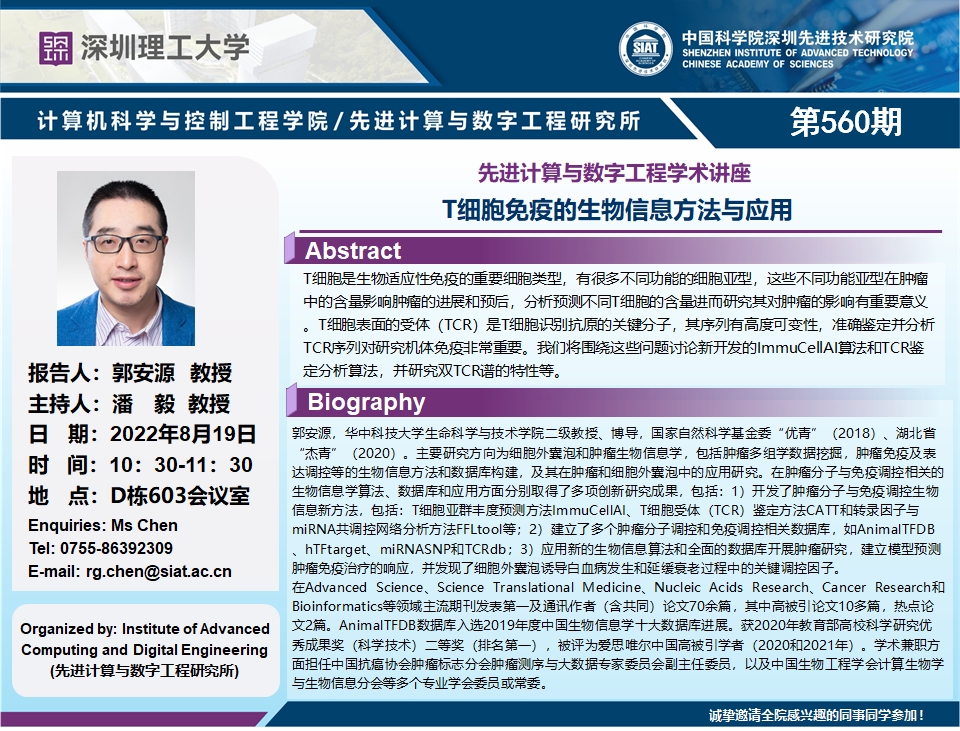 大家好!先进计算与数字工程研究所/计算机学院学术讲座第560期将于8月19日10:30-11:30在D栋603会议室举行,本次讲座将邀请华中科技大学 郭安源 教授作题为“T细胞免疫的生物信息方法与应用”的报告。本次报告将由计算机学院 潘毅 教授主持,诚挚邀请大家参加、学习和交流!