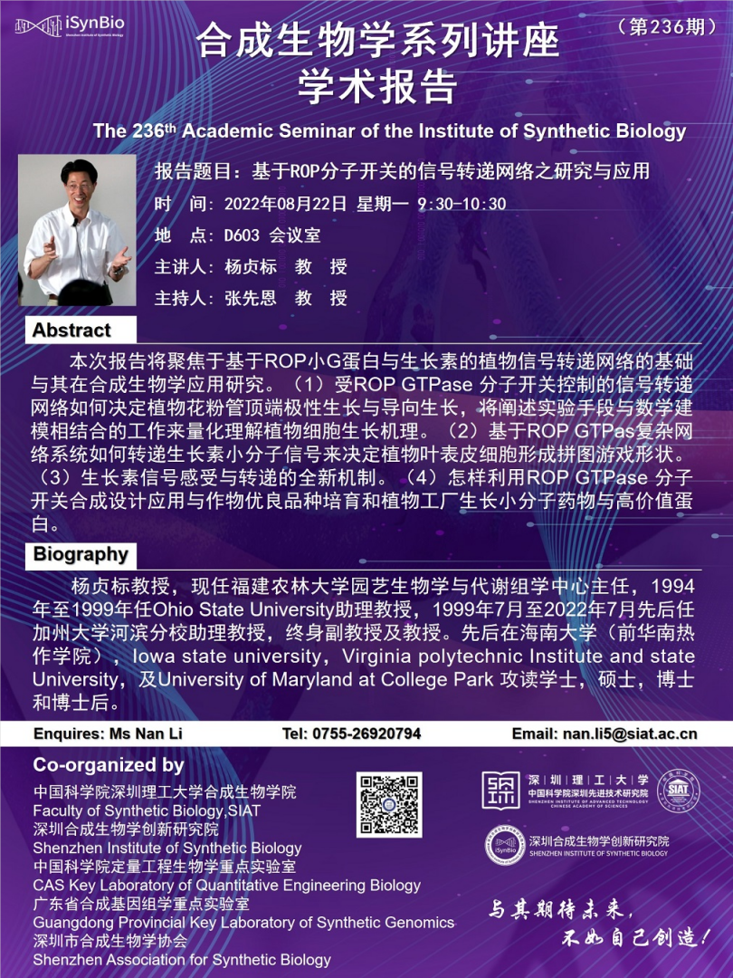合成所/合成生物学院第236期学术讲座将于 8月22日(周一)9:30-10:30 在 D603 会议室 举行。