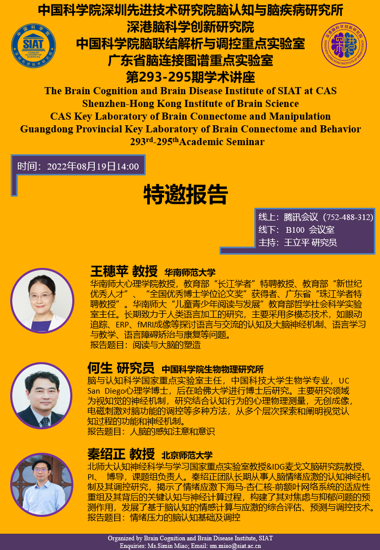 【2022年08月19日 脑认知与脑疾病研究所】“阅读与大脑的塑造”;“人脑的感知注意和意识”;“情绪压力的脑认知基础及调控”