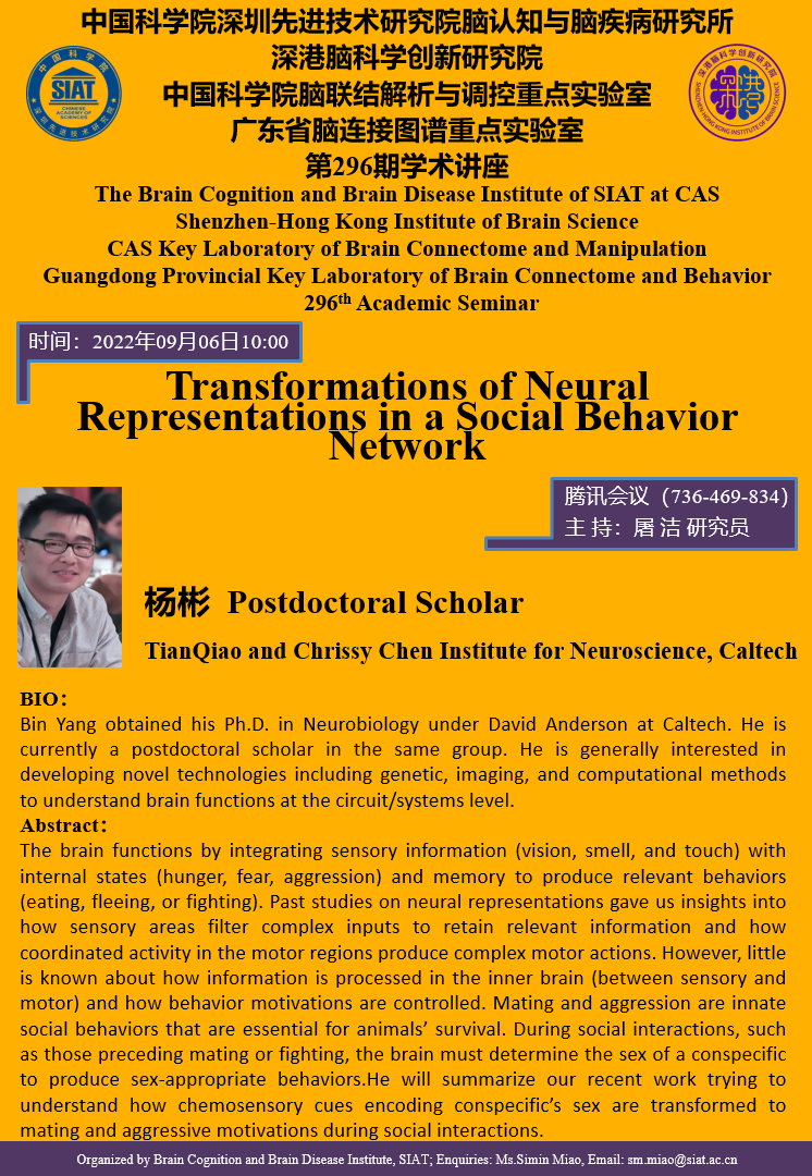 由TianQiao and Chrissy Chen Institute for Neuroscience, Caltech,Bin Yang,带来作题为“Transformations of Neural Representations in a Social Behavior Network”的专题报告。