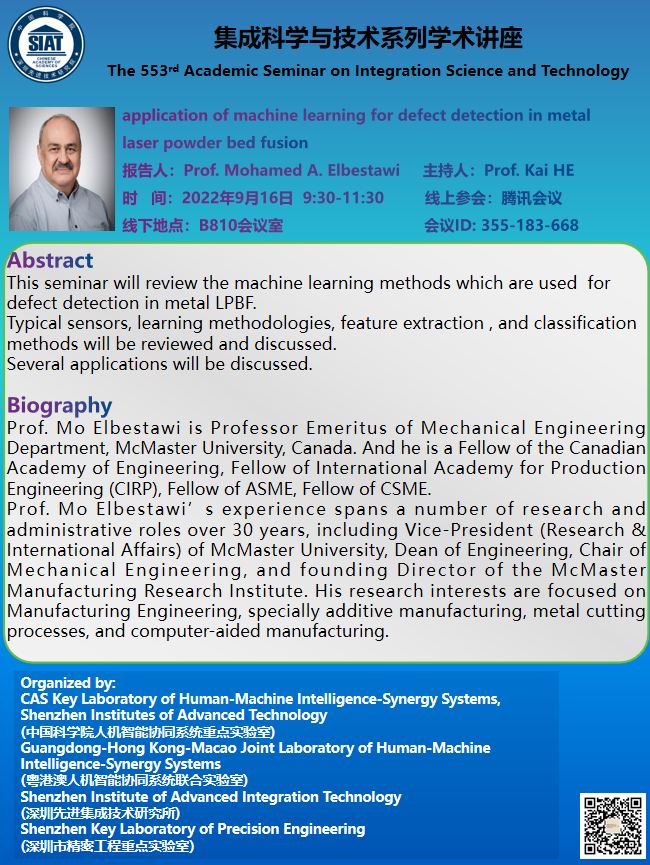 集成所第553期集成科学与技术系列学术讲座将于9月16日(周五)上午9:30-11:30在B810会议室召开,线上腾讯会议号:355-183-668。本次讲座特邀麦克马斯特大学机械工程系名誉教授、2021 CAS PIFI杰出学者Mohamed A. Elbestawi作题为《application of machine learning for defect detection in metal laser powder bed fusion》的学术报告。