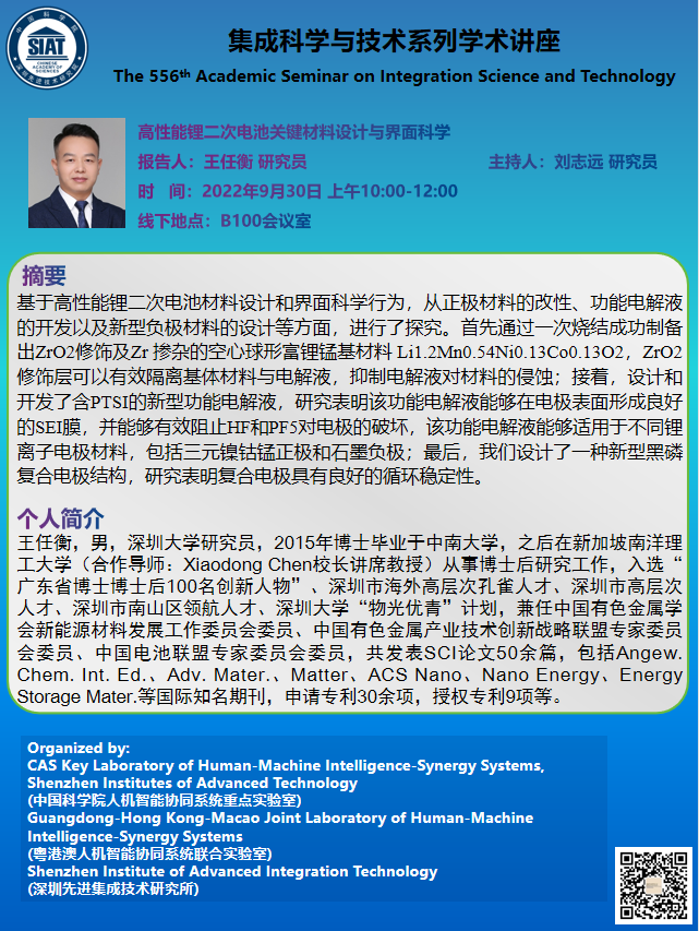 大家好! 集成所第556期集成科学与技术系列学术讲座将于9月30日上午10:00-12:00在B100会议室召开。本次讲座特邀深圳大学的王任衡 研究员作题为《高性能锂二次电池关键材料设计与界面科学》的学术报告。 会议由神经工程研究中心的刘志远 研究员主持,诚挚邀请大家准时参加、学习和交流! 讲座具体信息如下: