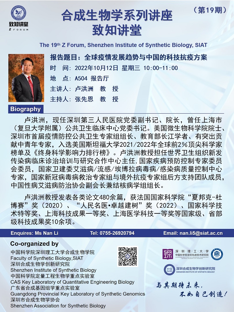 深圳合成生物学创新研究院/合成生物学研究所/合成生物学院“致知讲堂”第十九期将于 2022年10月12日(周三)10:00-11:00 在 A504报告厅 进行。