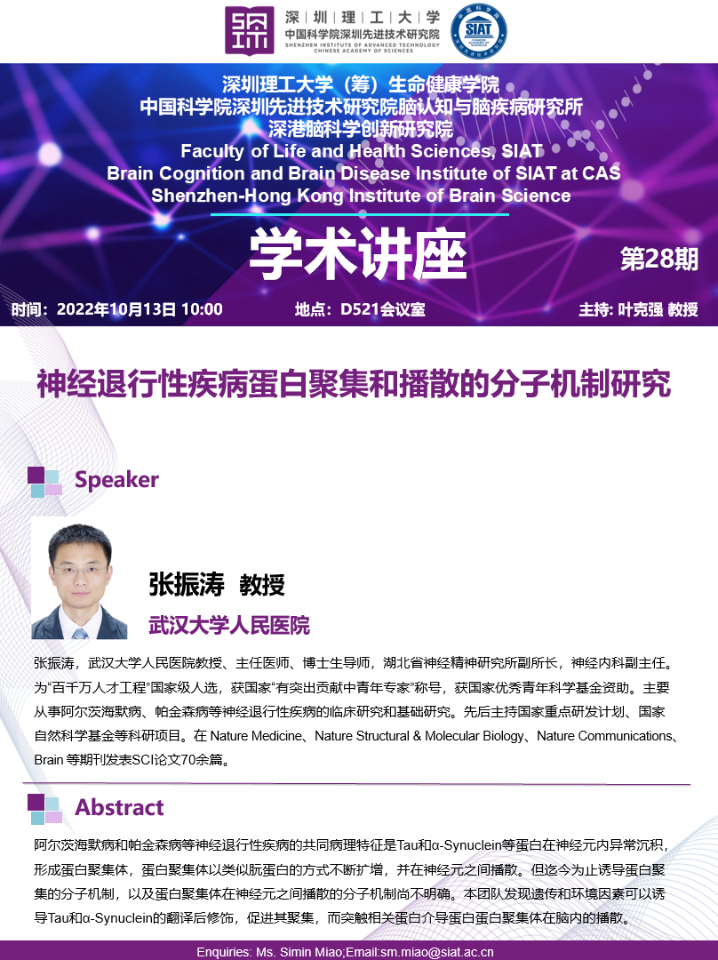 【2022年10月13日 生命健康学院/脑所】神经退行性疾病蛋白聚集和播散的分子机制研究