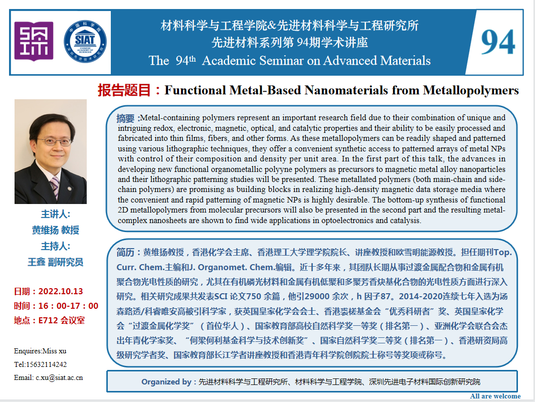 本次讲座邀请了 香港理工大学 黄维扬 教授 带来题为“Functional Metal-Based Nanomaterials from Metallopolymers”的报告。
