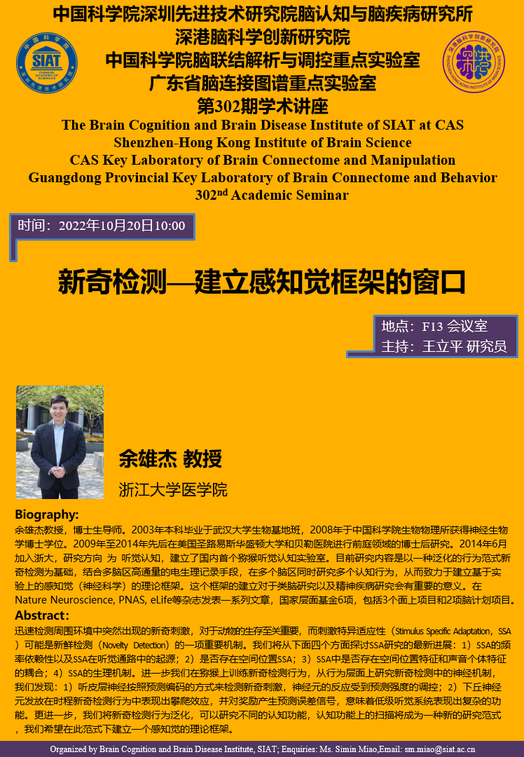 由浙江大学医学院,余雄杰教授,带来“新奇检测—建立感知觉框架的窗口”的专题报告。