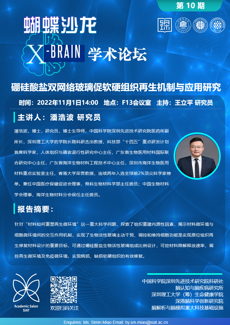本次讲座由医药所,潘浩波研究员,带来“硼硅酸盐双网络玻璃促软硬组织再生机制与应用研究”的专题报告。