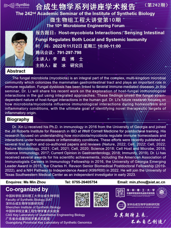 本次讲座邀请了 康奈尔医学院 李鑫 博士 带来题为“Host-mycobiota Interactions: Sensing Intestinal Fungi Regulates Both Local and Systemic Immunity”的报告。