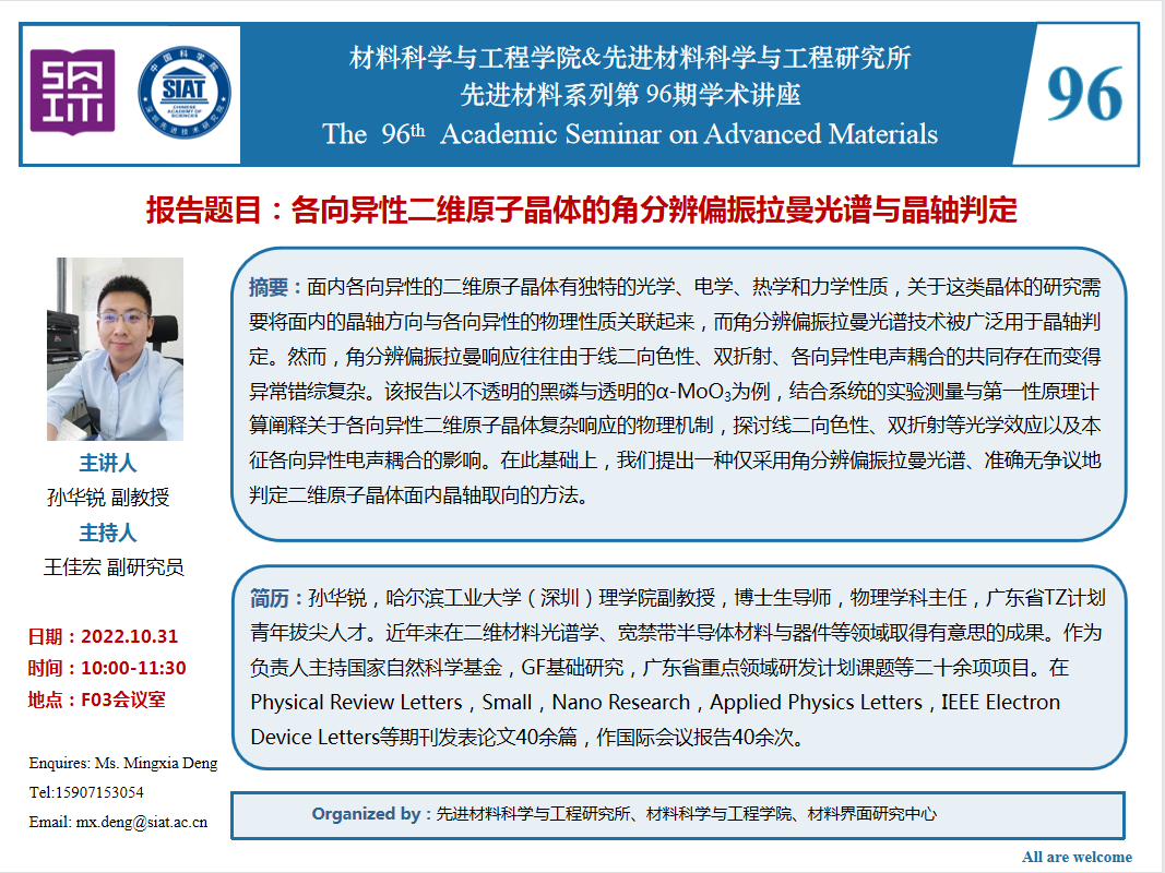 【2022年10月31日 材料科学与工程学院 & 先进材料科学与工程研究所】各向异性二维原子晶体的角分辨偏振拉曼光谱与晶轴判定