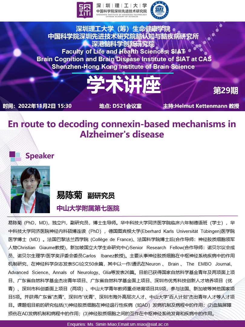 由中山大学附属第七医院,易陈菊副研究员带来“En route to decoding connexin-based mechanisms in Alzheimer's disease”的专题讲座。