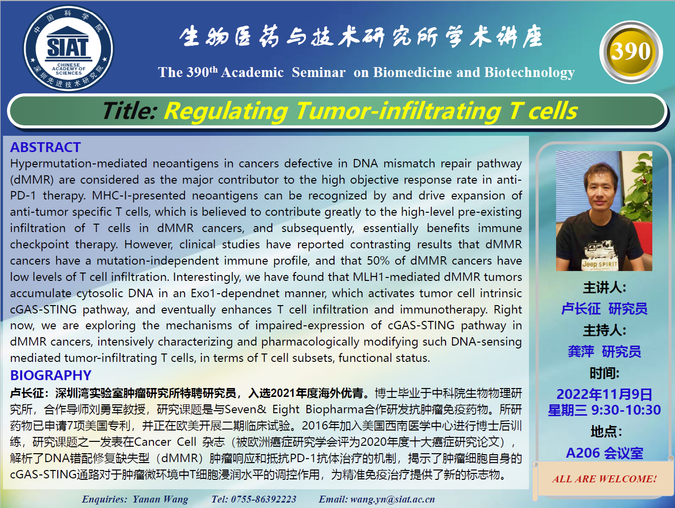 医药所第390期学术讲座将于2022年11月9日 星期五 9:30-10:30 A206会议室 举行。本次讲座邀请了来自深圳湾实验室肿瘤研究所,卢长征 研究员带来“Regulating Tumor-infiltrating T cells”的报告。届时,龚萍 研究员 将主持讲座。