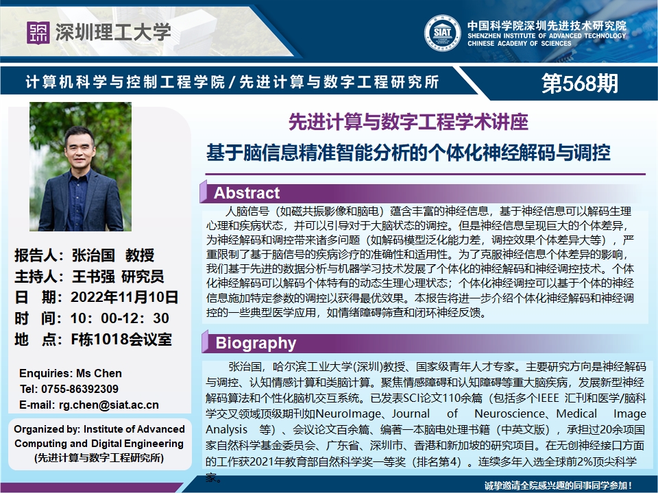 大家好!先进计算与数字工程研究所/计算机学院学术讲座第568期将于11月10日10:00-12:30在F栋1018会议室举行,本次讲座将邀请哈尔滨工业大学(深圳) 张治国 教授作题为“基于脑信息精准智能分析的个体化神经解码与调控”的报告。本次报告将由数字所 王书强 研究员主持,诚挚邀请大家参加、学习和交流!