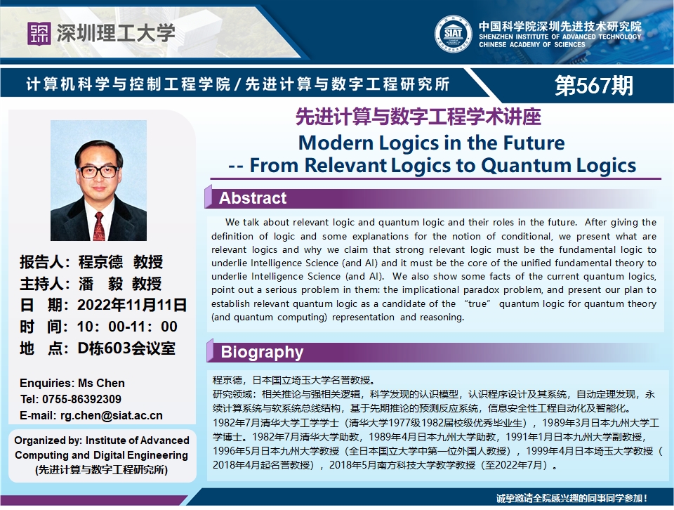 大家好!先进计算与数字工程研究所/计算机学院学术讲座第567期将于11月11日10:00-11:00在D栋603会议室举行,本次讲座将邀请日本国立埼玉大学 程京德 教授作题为“Modern Logics in the Future -- From Relevant Logics to Quantum Logics”的报告。本次报告将由计算机学院 潘毅 教授主持,诚挚邀请大家参加、学习和交流!
