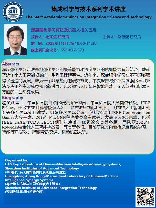 集成所第560期集成科学与技术系列学术讲座将于2022年11月17日早上10:00-11:30在线上召开,线上腾讯会议号:552-877-373。本次讲座特邀中国科学院自动化研究所的赵冬斌 研究员作题为《深度强化学习算法及机器人相关应用》的学术报告。
