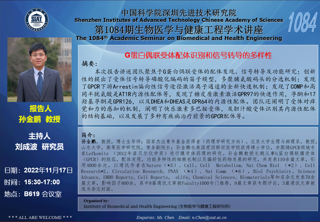 医工所第1084期学术讲座将于 2022年11月17日(周四)15:30-17:00 在 B619会议室 举行。