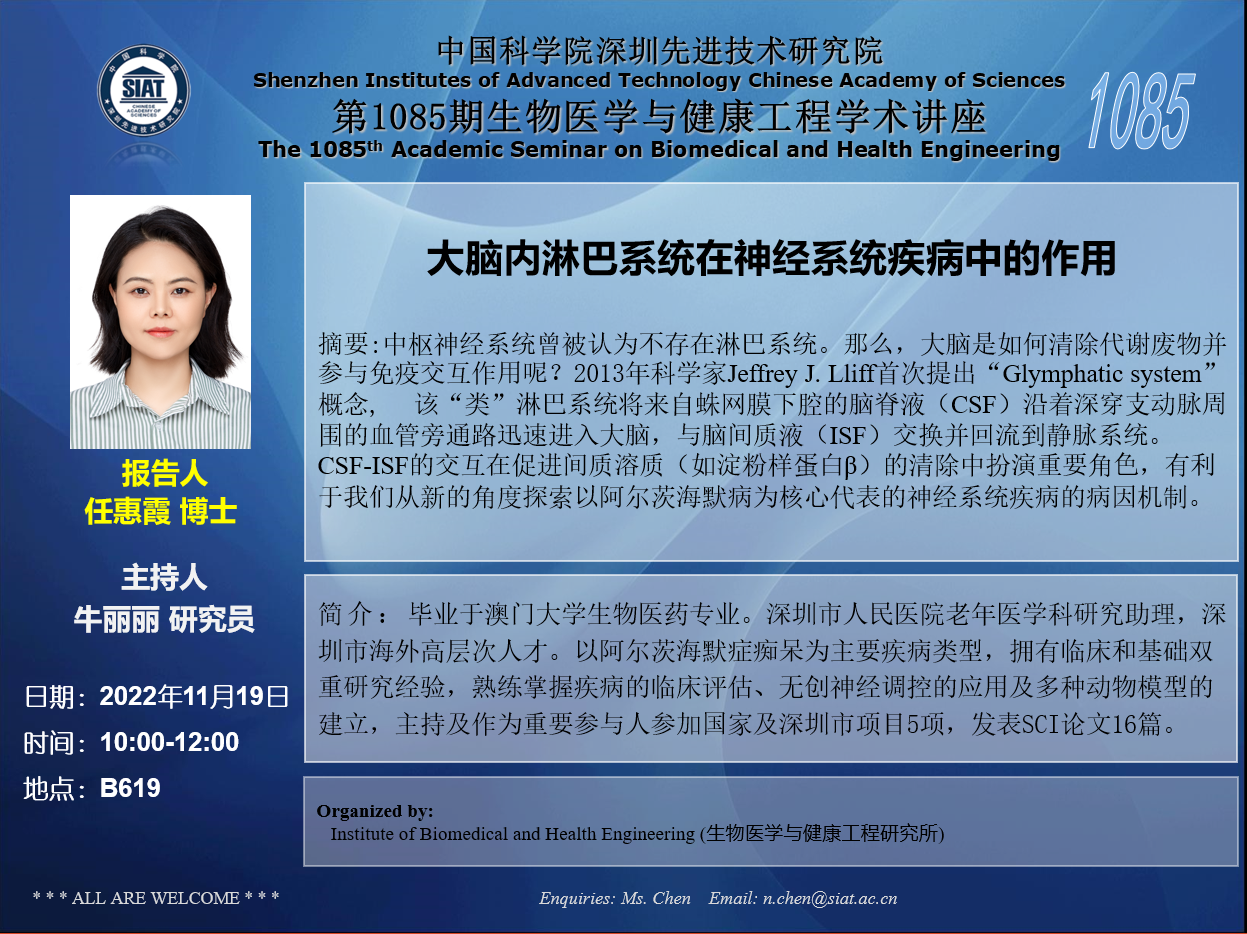 本次讲座邀请了 深圳市人民医院 任惠霞 博士 带来题为“大脑内淋巴系统在神经系统疾病中的作用”的报告。