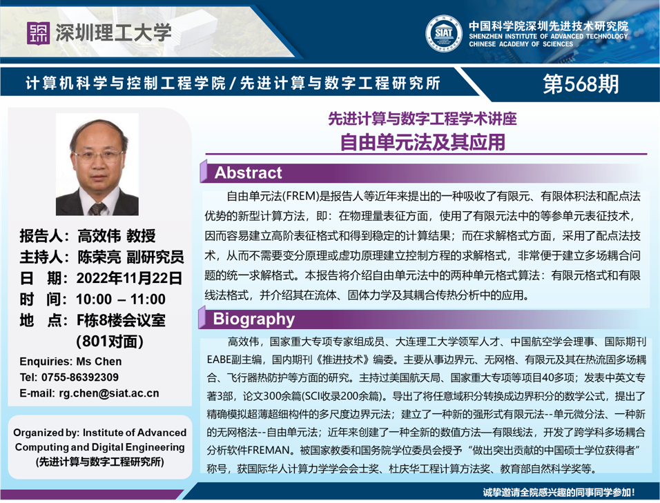 大家好!先进计算与数字工程研究所/计算机学院学术讲座第568期将于11月22日10:00-11:00在F栋8楼会议室(在801对面)举行,本次讲座将邀请大连理工大学 高效伟 教授作题为“自由单元法及其应用”的报告。本次报告将由数字所 陈荣亮 副研究员主持,诚挚邀请大家参加、学习和交流!