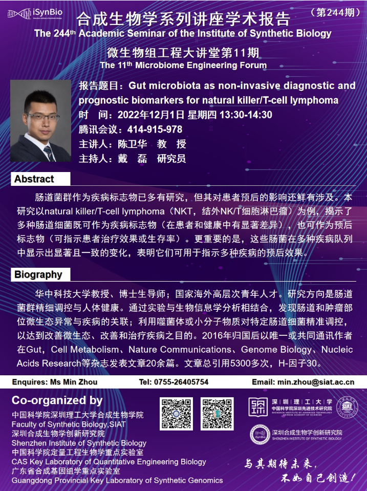 合成所/合成生物学院第244期学术讲座将于 12月1日(周四)13:30-14:30 在 腾讯会议: 414 915 978 举行。