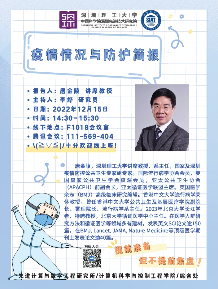 讲座特别邀请计算机科学与控制工程学院讲席教授、深圳市疫情防控公共卫生专家组专家唐金陵教授,从专业角度出发解读后疫情如何做好个人防护,指导SIAT师生为健康防护做好先手准备,安心过冬。