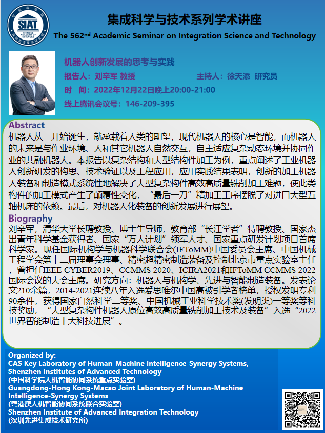 集成所第562期集成科学与技术系列学术讲座将于2022年12月22日晚上20:00-21:00在线上召开,腾讯会议号:146-209-395。本次讲座特邀清华大学的刘辛军 教授作题为《机器人创新发展的思考与实践》的学术报告。