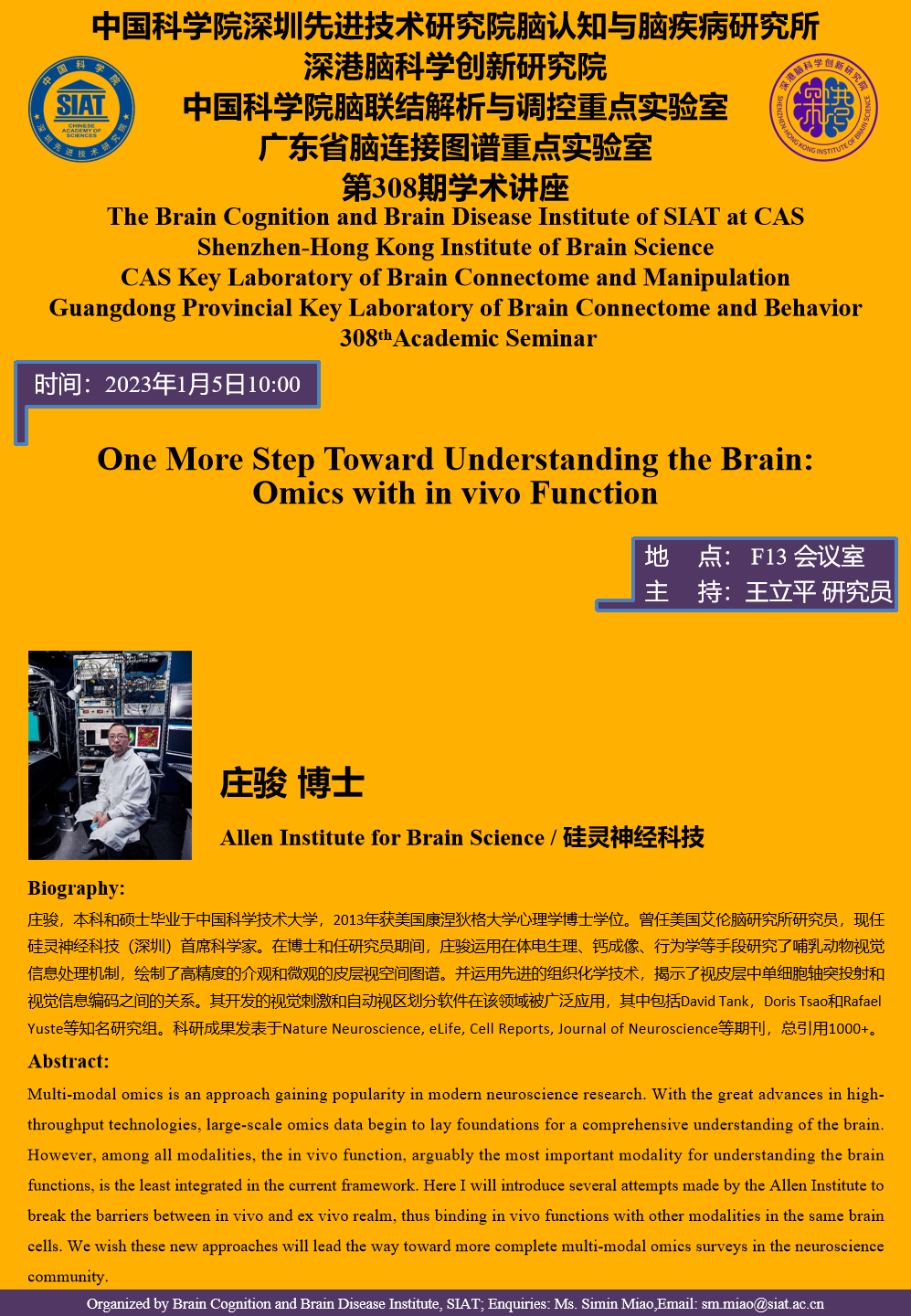 由Allen Institute for Brain Science / 硅灵神经科技, 庄骏博士,带来“One More Step Toward Understanding the Brain: Omics with in vivo Function”的专题报告。