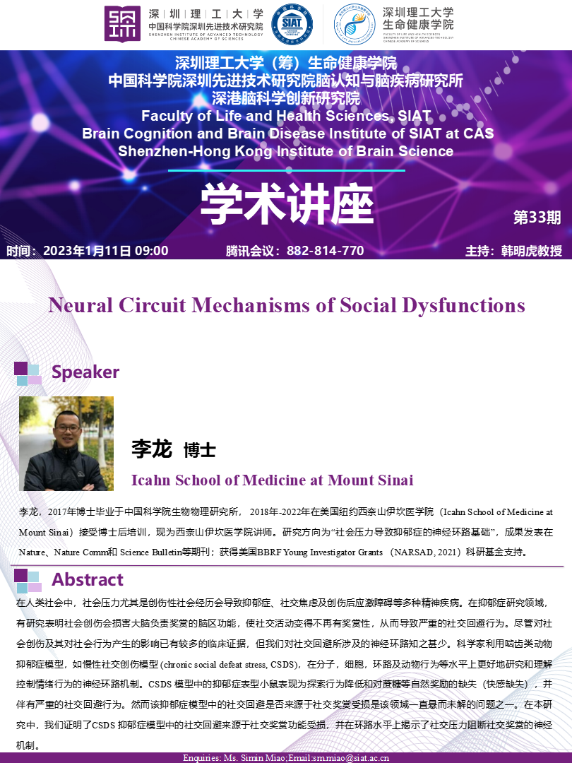 【2023年1月11日 生命健康学院/脑所】Neural Circuit Mechanisms of Social Dysfunctions