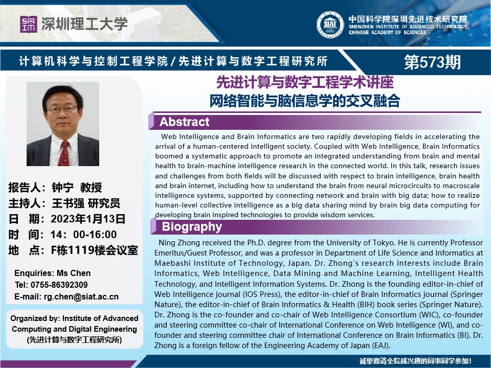大家好!先进计算与数字工程研究所/计算机学院学术讲座第573期将于2023年1月13日14:00-16:00在F1119会议室举行,本次讲座将邀请日本前桥工科大学 钟宁 教授作题为“网络智能与脑信息学的交叉融合”的报告。本次报告将由数字所 王书强 研究员主持,诚挚邀请大家参加、学习和交流!