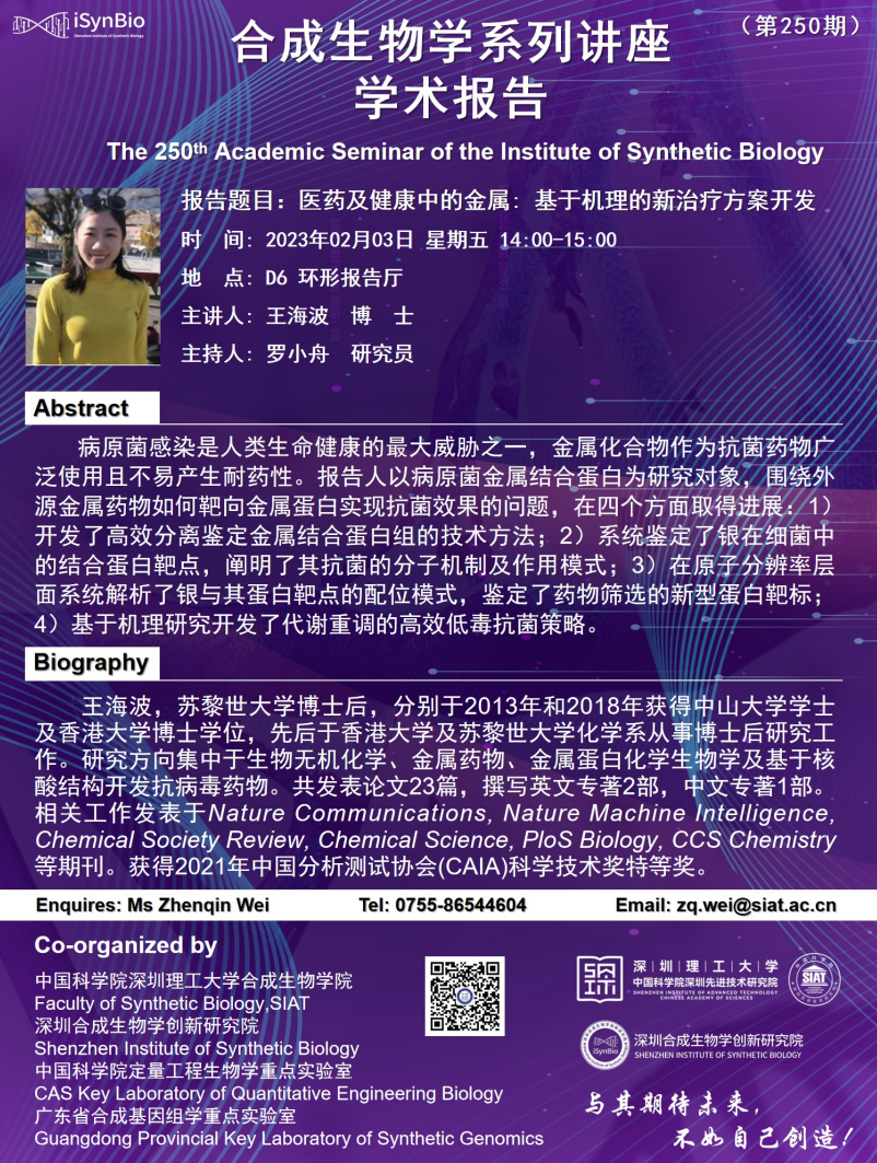 合成所/合成生物学院第250期学术讲座将于 2月3日(周五)14:00-15:00 在 D6 环形报告厅 举行。