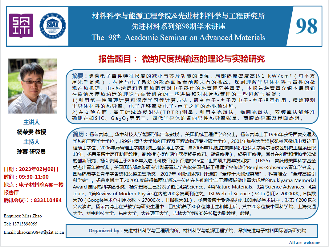 【2023年2月9日 材料科学与能源工程学院 & 先进材料科学与工程研究所】微纳尺度热输运的理论与实验研究