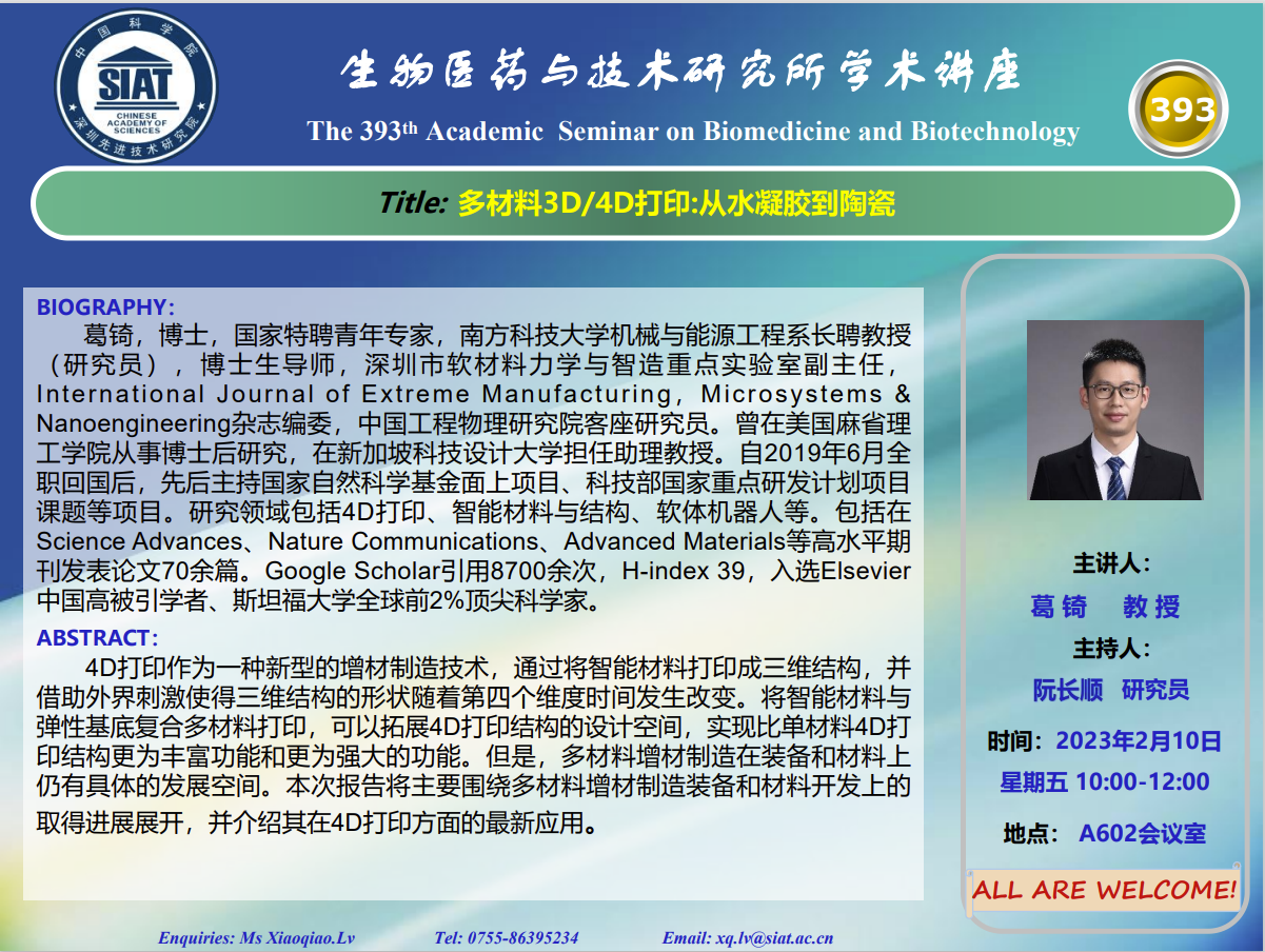 医药所第393期学术讲座将于2023年2月10日 星期五 10:00-12:00 A602会议室 举行。本次讲座邀请了来自南方科技大学,葛锜 教授带来“多材料3D/4D打印:从水凝胶到陶瓷”的报告。届时,阮长顺 研究员 将主持讲座。