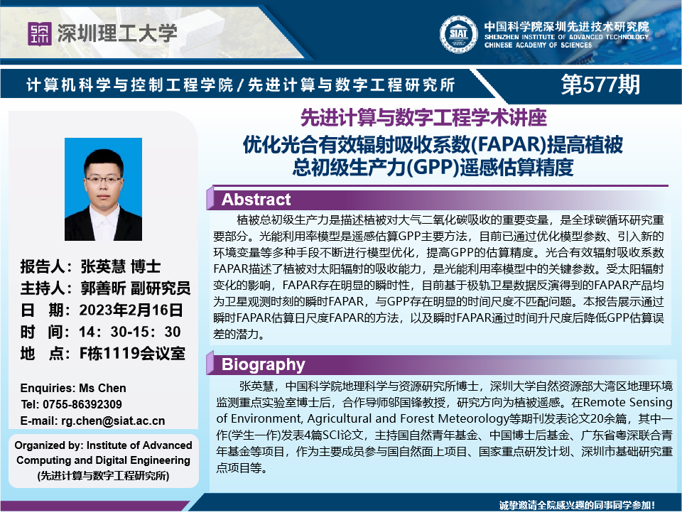 大家好!计算机学院/先进计算与数字工程研究所学术讲座第577期将于2月16日14:30-15:30在F栋1119会议室举行,本次讲座将邀请深圳大学 张英慧 博士作题为“优化光合有效辐射吸收系数(FAPAR)提高植被总初级生产力(GPP)遥感估算精度”的报告。本次报告将由数字所 郭善昕 副研究员主持,诚挚邀请大家参加、学习和交流!