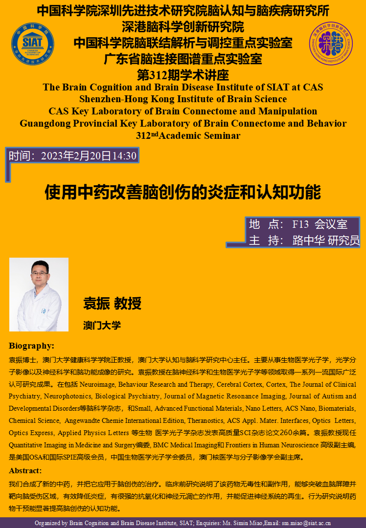 脑认知与脑疾病研究所将于2023年2月20日14:30,举办第312期学术讲座。