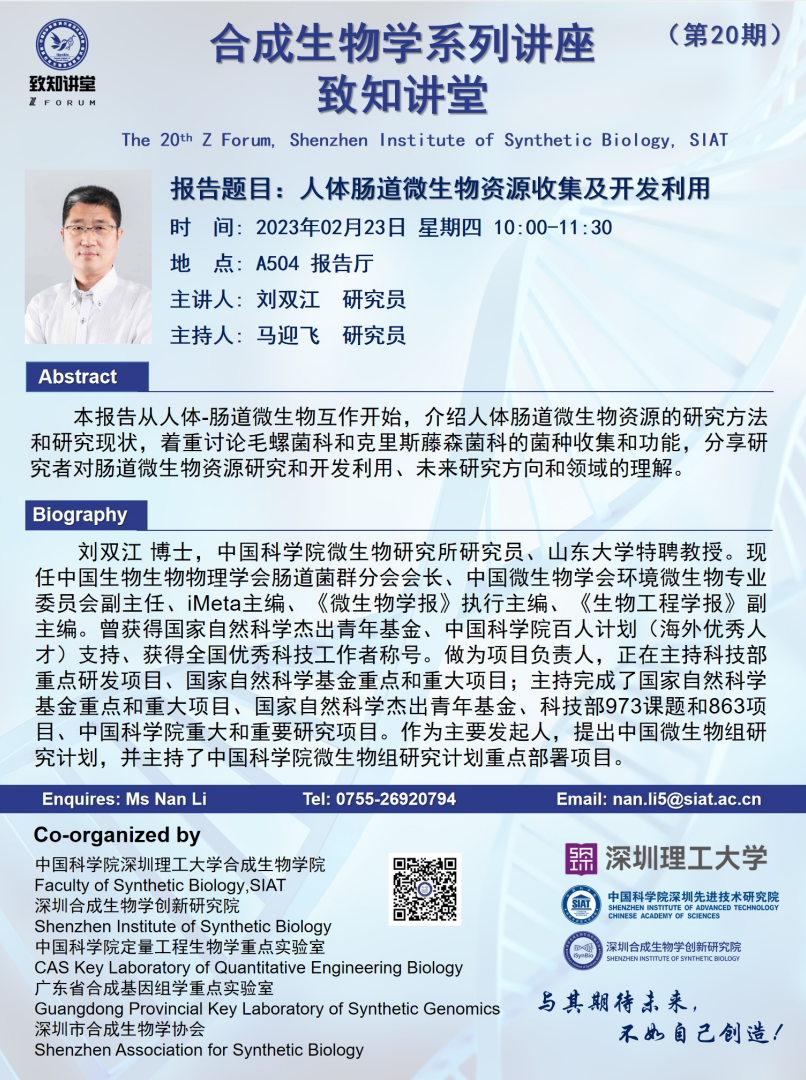 深圳合成生物学创新研究院/合成生物学研究所/合成生物学院“致知讲堂”第二十期将于 2023年2月23日(周四)10:00-11:30 在 A504报告厅 进行。