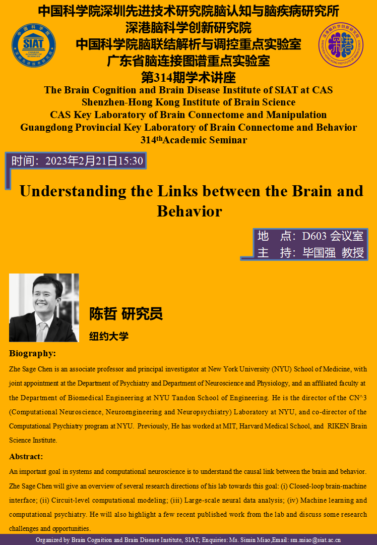 脑认知与脑疾病研究所将于2023年2月21日15:30,举办第314期学术讲座。